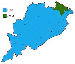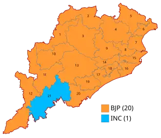 Bharatiya Janata Party clean sweeped the state by winning 20 out of 21 seats.[5][6] Indian National Congress won the Koraput seat.