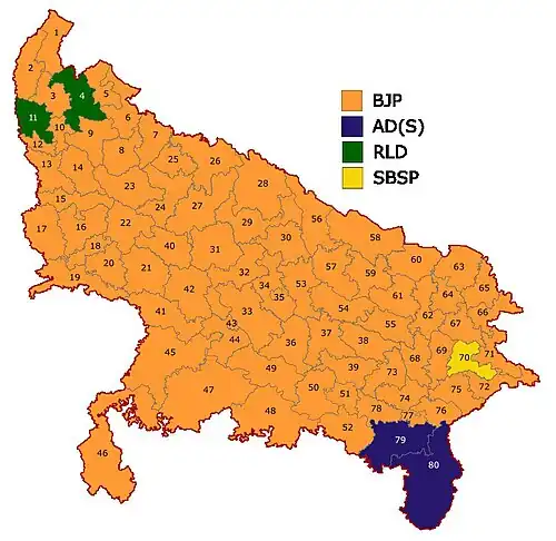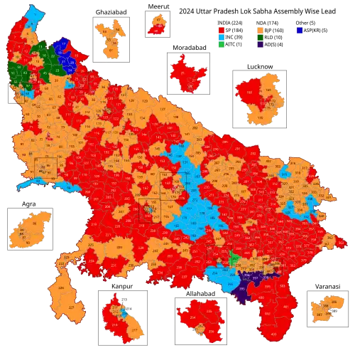 Partywise result map of the 2024 general election in Uttar Pradesh Alliance wise result map of the 2024 general election in Uttar Pradesh