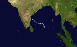 On 14 November, the Bureau of Meteorology noted that a tropical low could form west of Sumatra.[62] Several days later, they noted that the tropical low was developing.[63] Further consolidation due to a westerly wind burst led to the formation of a low-pressure area over Southeast Bay of Bengal and a deadly twin cyclone on 23 November.[64] By 24 November, it intensified into a well-marked low pressure area. It intensified further into a depression on 25 November, moving northwestwards towards Tamil Nadu and Sri Lanka coast. On 26 November, it intensified further into a deep depression, later moving into Sri Lanka. On 29 November, the system strengthened into a cyclonic storm and hence was named Fengal by the IMD.[65] On 30 November, the cyclonic storm made landfall between Karaikal and Mahabalipuram close to Puducherry as a cyclonic storm.[66][67] The next day, on 1 December, the remnants of the cyclone weakened to a deep depression and then further into a depression over the same region.[68] It weakened further into a remnant low over north interior Tamil Nadu on 2 December.[69] Subsequently, the system emerged over coastal Karnataka and proceeded into the Arabian Sea,[70] and dissipated 2 days later.