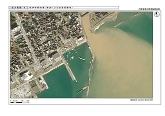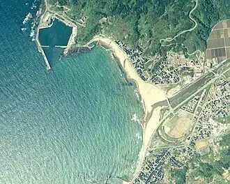 The coastline in the Kawaura district of Suzu moved 175 m (574 ft) seawards due to the coastal uplift, while the land area expanded by a total of 2.4 km2 (0.93 sq mi). A port in the Ozawa district of Wajima was entirely drained.[35] A seaward movement of 240 m (790 ft) was detected in the coasts of Monzenmachi and Kuroshimamachi districts in Wajima, as well as an expansion of 4.4 km2 (1.7 sq mi) in the Noto Peninsula. Areas in the northern part of the peninsula were also found to have risen while the southern sections, particularly in Anamizu, had subsided.[36]