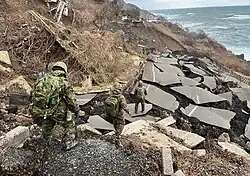 The Geospatial Information Authority of Japan (GSI) said parts of the country moved up to 1.3 m (4 ft 3 in) westwards with the maximum displacement observed at Wajima due to crustal deformation. At Anamizu, land shifted 1 m (3 ft 3 in) westwards. However, the agency said these movements could be slope or local ground movement instead.[30] The agency also added that crustal uplift of 4 m (13 ft) occurred in western Wajima and 1.1 m (3 ft 7 in) in northern Suzu.[31] Near Wajima's port, the shoreline of a sandy beach was moved 250 m (820 ft) seawards due to the coastal uplift.[32] Uplift at Kaiso Fishing Port in Wajima by 4 m (13 ft) exposed parts of the seafloor.[33][34]