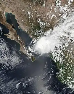 A tropical wave left the coast of Africa on July 10. The wave approached Central America over a week later, interacting with the Eastern Pacific monsoon trough. The combined disturbance continued westward, and began to organize its shower and thunderstorm activity on July 23 to the southwest of Mexico. The system eventually organized into a tropical depression at 12:00 UTC on July 24, about 400 nautical miles south of Cabo San Lucas.[21] Bud moved to the northwest, and despite being embedded in an environment of dry air,[22] the system was able to strengthen modestly and achieved its peak intensity at 6:00 UTC on July 25, with maximum sustained winds of 60 mph (97 km/h) and a minimum barometric pressure of 1,001 mbar (29.6 inHg).[21] Continued movement through a dry-air environment caused Bud to weaken later that day,[23] and the storm degenerated to a post-tropical cyclone the following day. Bud's remnant low drifted to the southwest until dissipating by July 29.[21]
