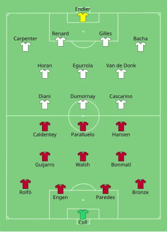 In the early minutes of the match, Barcelona defender Irene Paredes went down with ankle pain following a challenge from Lyon attacker Melchie Dumornay, but was able to continue; moments after play resumed, Dumornay created the first chance of the game but the ball was intercepted by Barcelona's Lucy Bronze. Barcelona immediately responded, but Salma Paralluelo's shot in the 6th minute was easily saved by Christiane Endler. Other chances fell to Barcelona, without success, before Lyon won a corner in the 14th minute and nearly scored from a mislaid clearance by Bronze before Cata Coll collected the ball at the second time of asking. Minutes later, Barcelona won a free kick in their attacking third, which was cleared, before winger Caroline Graham Hansen sent in another cross – this one dragged wide by an overlapping Bronze. Equal play resumed, including more physical challenges between Paredes and Dumornay, until the 28th minute, when Barcelona's Mariona Caldentey was able to win and carry the ball through the midfield unchallenged; her shot was messily saved by Endler. The next big chance fell to Lyon in the 36th minute, when Coll could only parry a cross back into the box; Paredes intercepted and Barcelona again took the ball to their attacking third through Graham Hansen. Calls for a penalty in the 37th minute after Paralluelo ended up on the ground in the box were dismissed and Lyon was awarded a free kick. They won a corner moments later, with imposing defender Wendie Renard's header easily saved by Coll. Graham Hansen spurred on Barcelona's attack before having her own good chance in the 44th minute, also dragging it wide. Following two additional minutes, the first half ended goalless.[20]