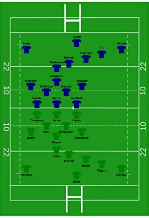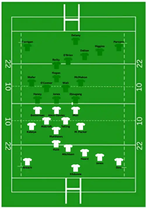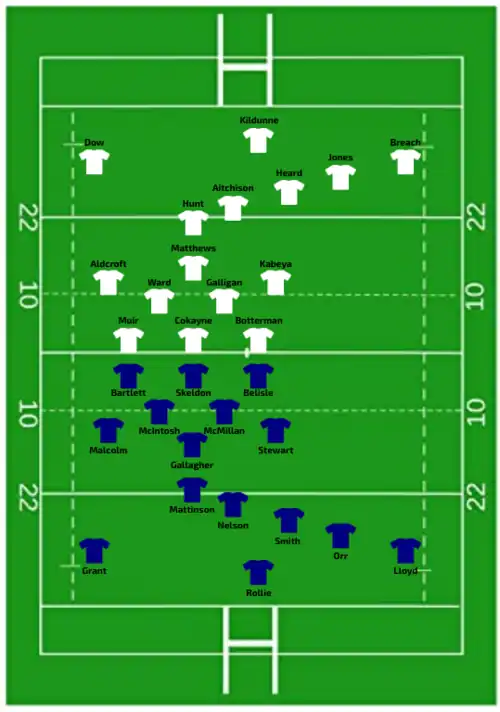 | Try: Muir 8' m Aldcroft 15' c Botterman 24' c Atkin-Davies 40' +2 m Kildunne (2) 43' m, 62' m Dow 46' m Galligan 58' c Con: Aitchison (3/8) 16', 25', 59' | Report | Try: Bevan 54' c Con: George (1/1) 55' Pen: George (1/1) 5' |