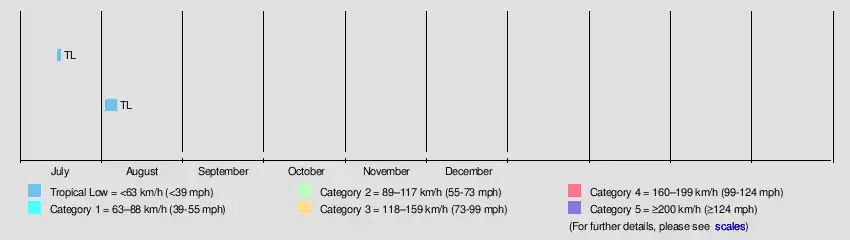 | TL | 15–16 Jul | Tropical low | 55 (35) | 1003 | None | None | 0 | |