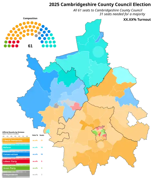 The 2025 Cambridgeshire County Council election took place as part of the 2025 local elections in the United Kingdom.[1] All 61 councillors were elected from 59 electoral divisions, which returned either one or two county councillors each by first-past-the-post voting for a four-year term of office. The election was held alongside the election of a Mayor of Cambridgeshire and Peterborough.[2] The council was under no overall control prior to the election. The election saw the Liberal Democrats win a majority of the seats on the council for the first time.