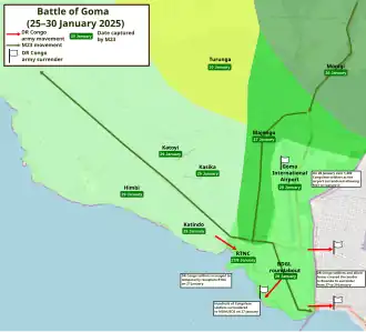 The 2025 Goma offensive was a military operation launched by the March 23 Movement (M23), a Congolese rebel group that is part of the Congo River Alliance (AFC) and is supported by Rwanda, against the regional capital of Goma in the Democratic Republic of the Congo (DRC). It lasted from January 23 to January 30, 2025. The campaign was part of the larger M23 campaign in the North and South Kivu provinces of the DRC, which resumed in October 2024 after a pause. During January 2025 the M23 rebels made a rapid advance in the Kivu region, cutting off the road connections to the North Kivu provincial capital of Goma by January 23 and arriving in the city on January 25.