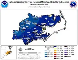 Further north along the North Carolina coast, widespread reports of 4–6 inches of snow in Beaufort, Carteret, Craven, Dare, Hyde, Onslow, and Pamlico counties were common. At the Wright Brothers National Memorial, 9.0 inches (23 cm) was reported.[51]