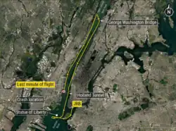 At 2:59 p.m. EDT, the helicopter took off from the Downtown Manhattan Heliport (JRB) on its eighth flight of the day. It traveled along the southern part of Manhattan and circled near the Statue of Liberty before flying up the Hudson River along the western side of Manhattan. At 3:08 p.m., the helicopter turned around near the George Washington Bridge before flying south along the New Jersey shoreline. The pilot radioed to say that he was returning to the heliport to refuel.[2][9]