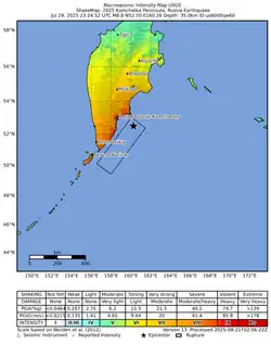 On 30 July 2025, at 11:24:52 PETT (23:24:52 UTC, 29 July), a Mw 8.8 megathrust earthquake struck off the eastern coast of the Kamchatka Peninsula in the Russian Far East, 119 km (74 mi) east-southeast of the coastal city of Petropavlovsk-Kamchatsky.[3][4] It was the most powerful earthquake recorded worldwide since the 2011 Tōhoku earthquake,[5] and is tied with the 1906 Ecuador–Colombia and 2010 Chile earthquakes as the sixth-strongest earthquake ever recorded by seismometers.[6] However, it caused minimal damage compared to other earthquakes of similar magnitude.[7][8] The earthquake caused moderate damage and multiple injuries in Kamchatka Krai and Sakhalin Oblast. The subsequent Pacific-wide tsunami was weaker than expected, with waves approximately 1 m (3 ft) or less in most places.[9] However, a locally high run-up of 19 m (62 ft) as a result of a wave splash was recorded on Shumshu. One indirect fatality and 21 injuries were attributed to tsunami-related evacuations in Japan.
