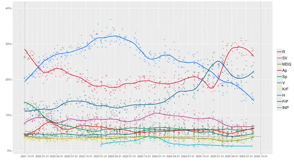 - ^ "pollofpolls.no - Gjennomsnitt av nasjonale målinger med spørsmål om stortingsvalg august 2025". www.pollofpolls.no. Retrieved 16 August 2025.