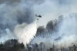 ![]() A South Carolina Army National Guard helicopter conducts aerial water-bucket operations on the Table Rock and Persimmon Ridge wildfires in Pickens County, S.C., March 23, 2025. |