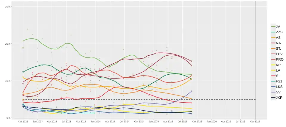 | SKDS/LTV[4] | Jan 2025 | 1,791 | 11.4 | 9.5 | 9.1 | 18.1 | 7.7 | 14.2 | 10.6 | 1.7 | 2.4 | 5.4 | 0.1 | 1.4 | 4.0 | 1.9 | 2.4 | 3.9 |
