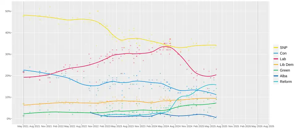 Under the Scottish Elections (Reform) Act 2020, an ordinary general election to the Scottish Parliament would normally be held on the first Thursday in May five years after the 2021 election, i.e. on 7 May 2026.[1] This Act superseded the Scotland Act 1998, which had set elections in every fourth year.[2]