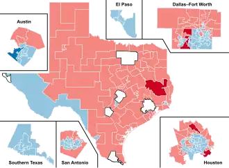 In the 2024 presidential election in Texas, Republican Donald Trump won 96 districts, while Democrat Kamala Harris won 54 districts. In the aftermath of the 2024 election, Democrats now hold 8 districts in which Trump won, while Republicans hold no districts won by Harris.