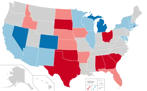 ![]() Democratic incumbent Term-limited Democrat Republican incumbent Term-limited or retiring Republican No election | |||||||||||||