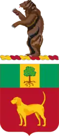 - Shield: The shield is red for Artillery, charged with the indispensable companion of the Regiment, the Regiment having been for years known as "The Houn’ Dawg Regiment." The green chief represents the Mexican Border service, the yellow pale the Spanish War service and the oak tree the Argonne Forest, the Meuse-Argonne of World War