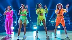 On 27 February 2021, the band made their first performance in a decade on the Das Erste music show Schlagerchampions – Das grosse Fest der Besten, hosted by singer Florian Silbereisen, where they performed "Daylight in Your Eyes."[33] Following a short hiatus, the band reunited on 28 May 2021 to perform a medley of the celebration versions of "Daylight in Your Eyes", "Rivers of Joy" and "There Must Be an Angel" at the season finale of the dance competition television series Let's Dance.[34] The performance was largely panned by critics, who criticized the band for singing lip sync.[34] On 4 June 2021, No Angels played a live streaming concert on RTL Deutschland's website rtl.de. A mini-concert consisting of "There Must Be an Angel", "Still in Love with You", "Rivers of Joy", "A New Day" and "Daylight in Your Eyes," the broadcast was interrupted by a storm front across Cologne only minutes after their performance.[20] Two days later, the band performed "Still in Love with You" and "Daylight in Your Eyes" on ZDF-Fernsehgarten, broadcast live from the grounds of the ZDF broadcasting centre at Mainz.[35] On 17 June, No Angels appeared on Die Carolin Kebekus Show where they sung a shortened version of "Still in Love with You" and performed a girl band medley along with host Carolin Kebekus.[36] On 24 July 2021, No Angels appeared on Gottschalks große 90er-Show where they performed a live version of the Spice Girls' "Too Much" (1997).[37] Following another break, the band reteamed in fall 2021 to perform the winter version of "When the Angels Sing" on Das Adventsfest der 100.000 Lichter, broadcast on 27 November.[38]