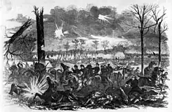 The consolidated regiment fought at the Battle of Stones River. In the battle, the consolidated regiment lost 187 men killed, wounded, or missing on 31 December 1862, while 129 became casualties on 2 January 1863. Major Guillet and Captain Brummerstadt were killed on 2 January and Captain Ryan died from his wounds on 20 January.[18] At Stones River, the 13th-20th Louisiana Infantry was in Adams' brigade, Major General John C. Breckinridge's division, Hardee's Corps, Bragg's Army of Tennessee. Adams' brigade was the same as at Perryville, except the 32nd Alabama Infantry was added.[19] On 31 December, Bragg ordered Breckinridge to attack the Round Forest, which had become a Federal strongpoint. When Adams' troops attacked, they became the target of four Union batteries. As the 13th-20th Louisiana moved to the attack, it was struck in its right flank by two Indiana regiments. Within 30 minutes, Adams' brigade was repulsed with the loss of 426 men killed and wounded.[20] On 2 January, Breckinridge's division assaulted the Union left flank, with Adams' brigade in the second line on the left. At first, the attack was a success, but the pursuing Confederates suddenly found themselves facing 45 Federal cannons. The subsequent bombardment stopped Breckinridge's soldiers and caused them to flee.[21]