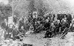 1889 reunion veterans of the 20th Maine Volunteer Infantry, at Gettysburg, Pennsylvania. General Joshua L. Chamberlain, the officer who commanded them in battle, is seated at center right, bracketed by the Maltese Cross banner of the V Corps (5th) and the unit's regimental flag. Left is a monument to the unit recently erected by its veterans.