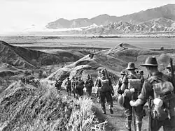 ![]() 21st Brigade troops moving down from the Finisterre Range into the Ramu Valley in November 1943 | |