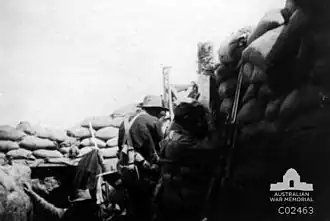 In early 1917, the Germans withdrew to the Hindenburg Line, after which the 22nd Battalion took part in a number of actions including the Battle of Bullecourt and the Battle of Broodseinde. In early 1918, the Germans launched a large-scale offensive – the Spring Offensive – following the collapse of Russia on the Eastern Front.[5] Throughout March and April, the 22nd Battalion undertook defensive duties as the German offensive was blunted, before the Allies launched their own offensive around Amiens in August. After this, the 22nd Battalion took part in a number of battles including the Battle of Mont St Quentin and the Battle of Montbrehain.[1] The fighting around Montbrehain, which took place on 5 October 1918, was the final action fought by Australian infantrymen on the Western Front during the war, and came as part of a series of attacks made by the Allies to breach the Hindenburg Line following the launch of the Hundred Days Offensive.[6] Following the successful attack, the 22nd Battalion moved to Abbeville where, along with the rest of the Australian Corps, they were withdrawn for rest and reorganisation due to heavy casualties.[7]