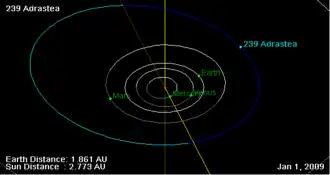 239 Adrastea is a main belt asteroid. It was discovered by Johann Palisa on 18 August 1884 in Vienna, and was named after the Greek nymph Adrasteia. This asteroid is orbiting the Sun at a distance of 2.97 AU with a period of 5.11 years and an eccentricity (ovalness) of 0.23. The orbital plane is tilted at an angle of 6.17° to the plane of the ecliptic.[1]