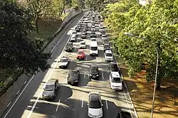 On January 25, 2004, the avenue was closed to traffic for the city's 450th anniversary celebrations.[29] In 2010, 23 de Maio Avenue was the second highest for accidents involving motorcyclists in São Paulo.[30][31] In January 2008, an exclusive motorcycle lane was tested. However, after two days, congestion on the road had doubled and the tests ended after the third day. In July 2010, after the opening of the motorcycle lane on Vergueiro Street, it was discussed banning motorcycles on the avenue, but the Secretary of Transportation, Marcelo Cardinale Branco, halted the proposal.[32][30] Besides the speed cameras on poles on the road, the Companhia de Engenharia de Tráfego (CET) installed two cameras on the Tutoia and Pedroso viaducts in 2011.[33]