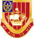 A Gold color metal and enamel device 1+1⁄8 inches (2.9 cm) in height overall consisting of a shield blazoned: Or, six pallets couped Gules, a ship of Cabrillo’s time Argent; on a canton Azure a fleur-de-lis encircled by a garland of laurel of the first. Attached below and to the sides of the shield a Red scroll inscribed “WE AIM TO HIT” in Gold letters.
