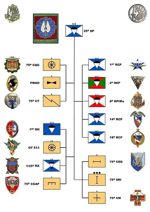 The 25th Parachute Division (French: 25e Division Parachutiste, 25e D.P) was an airborne division of the French Army, part of the French Airborne Units. Consisting mainly of air infantry specialized in airborne combat, air assault and established in 1956; the Parachute Division took principal part only in the Algerian War.