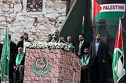 The guest of honor at the ceremony was Hamas leader in-exile Khaled Mashal, who arrived in Gaza Strip for the first time in his life, after entering the Gaza Strip through Egypt. In his speech, which Mashal gave at a mass rally attended by hundreds of thousands of supporters, he stated explicitly that the Palestinian people would never compromise with Israel's existence and that the organization will act decisively to gradually conquer and achieve full control over the whole region, which encompass both Israel and the Palestinian territories in order to establish one Islamic state in that region.[3][4]