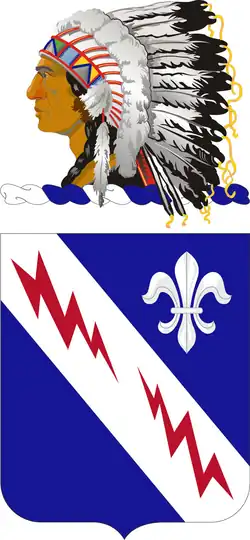 - Symbolism: The colors blue and white are for the Infantry, the original unit designation. The white bend represents a baldric (sword sling), which is a mark of military honor. The fleur-de-lis symbolizes service in World War I. The lightning bolts allude to the swift striking force of the Infantry, and also present the Regiment's assault landings at Sicily and Southern France in World War II.