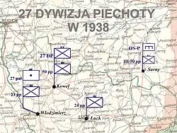 The 27 Infantry Division (Polish: 27 Dywizja Piechoty), was a unit of the Polish Army in the inter-war period. It was created on 18 October 1920, as a result of reorganization of the Army, from units of the 2nd I.D., 3rd I.D., and 13th I.D. Its headquarters were located in Kowel, with units stationed in other Volhynian towns, such as Lutsk, Sarny and Wlodzimierz Wolynski. The Division's first commandant was General Gustaw Kuchinka.