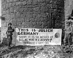 After a short rest, the division returned to XIX Corps and took part in the Battle of Aachen by moving to defensive positions along the Teveren-Geilenkirchen line supporting the 30th Infantry Division in Germany and maintained those positions through October.[8] On 16 November, the division began its drive to the Roer River, blasting its way through Siersdorf, Setterich, Durboslar, and Bettendorf, and reaching the Roer by the end of the month.[8] Heavy fighting reduced in Jülich Sportplatz and the Hasenfeld Gut on 8 December. The Division did not take part in the Battle of the Bulge as they were held in reserve for equipment refitting and received replacements of fresh troops arriving from England and France after training for weeks.[8]