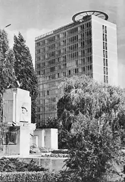 The building was commissioned by the housing cooperative of Wspólny Dach.[3] It was designed by architect Marek Leykam in modernist style, and was built between 1962 and 1963. The building was originally built with its south and north walls having elevation consisting fully of glass windows which reached from floors to ceilings. The glass walls were hold by concrete V-shaped s, one on each sides. The high-rise also had lift shafts partially covered in glass, through which were visible the loggias. In the building were located apartments and a library. It was also planned to place a revolving restaurant at the roof, which was never realized. The reminder of such plans is a concrete circle at the top of the building.[1][2]