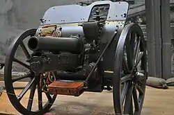 The 2nd West Riding Division (62nd (2nd West Riding) Division from August 1915) began assembling in the area of Derbyshire and Nottinghamshire from March 1915, but training for the 2nd Line artillery of the West Riding was carried out under exceptional difficulty. After the 1st Line had left for France in April the 2nd Line was issued with a few obsolete French De Bange 90 mm guns, with 20 rounds for each gun. The ammunition had been in storage for many years, and no-one could interpret the markings on the gunsights or the fuzes. At the same time the division with its obsolete equipment was under orders to entrain at short notice to assist in repelling any raid on the East Coast, with trains in readiness day and night.[53][54][55][56] The divisional commander later commented that if his artillery had been 'called upon to take part in the defence of the coast, the casualties it caused would have been at the breech-end of the guns'.[57]