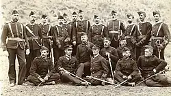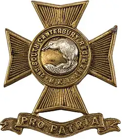 Volunteer corps were first raised in Canterbury in 1859, although it was not until 1866 that the first South Canterbury corps, the Timaru Rifle Volunteers, was formed. The Timaru Rifles, however, did not survive long and were disbanded in 1868. In the same year, the Temuka Volunteer Rifles were raised and it is from this corps that a continuous line of service begins. Over the course of the late 19th century, a number of other South Canterbury volunteer corps were raised. In 1886 the Canterbury based corps were grouped together into the 1st Battalion, Canterbury Rifle Volunteers, although the battalion was disestablished 2 years later.[1] Later in 1895 the rifle corps in the Canterbury Military District were once again grouped together into the Canterbury Battalion of Infantry Volunteers[2] and in 1897 the South Canterbury corps were transferred into the newly formed South Canterbury Battalion of Infantry Volunteers.[3][4][Note 1] Men from the South Canterbury Battalion served in South Africa during the Second Boer War as part of the New Zealand Mounted Rifles Contingents. The Battalion was subsequently awarded the battle honour "South Africa 1900-1902".[6]
