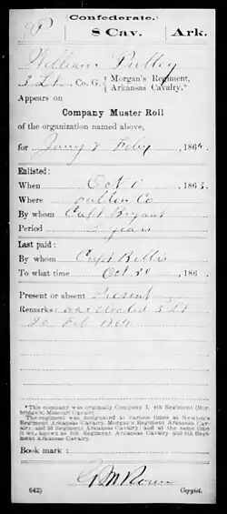 1. ^ Civil War Service Records for soldiers from Arkansas 8th Cavalry Regiment, National Archives and Records Administration, 8601 Adelphi Road, College Park, MD