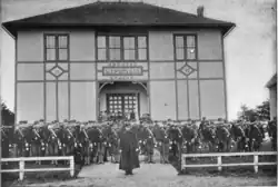 The regiment remained in the positions for the next several weeks, a period in which disease struck the men, incapacitating as many as 65%. The regiment was subsequently transferred to the Third Brigade of the corps' Second Division, and left Santiago for the United States on 12 August aboard the transport Mobile with the entire brigade, arriving at Montauk Point on 19 August. The regiment was sent to Camp Wickoff, where it was furloughed for sixty days.[12] At the conclusion of this period the 44 officers and 797 enlisted men of the regiment were mustered out of Federal service at Springfield on 3 November. While in service, the regiment lost one officer killed in action, three wounded, and two died of disease, while four enlisted men where killed in action, 41 wounded, four died of wounds, and 86 died of disease.[4]