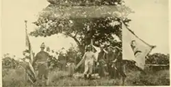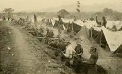 The regiment fought in the Battle of El Caney on 1 July.[4] The regiment, along with the 9th Massachusetts and the 71st New York, was among three state volunteer regiments to fight in combat during the Santiago Campaign and the only one to fight at El Caney.[8] During the engagement, the brigade, commanded by Brigadier General William Ludlow, was positioned southwest of the village of El Caney next to the main road. The regiment was armed with the black powder burning single-shot .45-caliber Springfield rifle, whose smoke revealed their positions to Spanish troops. Clark later wrote that no unit had ever gone into combat under worse conditions, as 55% of his men were untrained recruits.[9] The 2nd Massachusetts was ordered to halt its advance and instead hold its positions by Ludlow due to the inferiority of its armament.[10] The regiment lost one officer killed and three wounded, and four enlisted men killed in action, three died of wounds, and 33 wounded.[11]