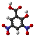 3,5-Dinitrosalicylic acid (DNS or DNSA, IUPAC name 2-hydroxy-3,5-dinitrobenzoic acid) is an aromatic compound that reacts with reducing sugars and other reducing molecules to form 3-amino-5-nitrosalicylic acid, which strongly absorbs light at 540 nm. It was first introduced as a method to detect reducing substances in urine by James B. Sumner[2] and has since been widely used, for example, for quantifying carbohydrate levels in blood.[3] It is mainly used in assay of alpha-amylase. However, enzymatic methods are usually preferred due to DNS's lack of specificity.[4]