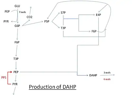 Pathway for the production of DAHP using glucose. Abbreviations: GLU: glucose, G6P: Glucose 6-phosphate, PEP: Phosphoenolpyruvate, PYR: Pyruvate, F6P: Fructose 6-phosphate, P5P: Pentose 5-phosphate (ribose or xylulose 5-phosphate) T3P: Glyceraldehyde 3-phosphate, S7P: Sedoheptulose 7-phosphate, E4P: Erythrose-4-phosphate, PPS: PEP synthase.