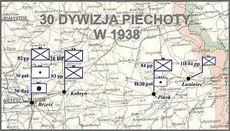 The 30th Polesie Infantry Division (Polish: 30. Poleska Dywizja Piechoty, abr. 30 DP), was a unit of the Polish Army in the inter-war period. It was stationed in Kobryn, as well as other towns of the Polesie Voivodeship - Brześć nad Bugiem and Pinsk. It was commanded by Colonel Mieczysław Mackiewicz (1921–26), General Stanisław Tessaro (1926–29), Colonel Stanisław Wrzaliński (1929–31) and General Emil Krukowicz-Przedrzymirski (1931-1938).