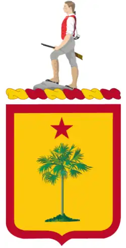The 314th's coat of arms was approved on 21 September 1925 and its distinctive unit insignia was approved on 30 October of that year. The distinctive unit insignia included a 1 1/8 in (2.86 cm) gold colored metal and enamel device, which consisted of a golden shield with a red star above a palmetto tree in the center and a red border. The shield's color represented cavalry, the red border its artillery service, the star its organization in Texas, and the palmetto its training at Camp Jackson in South Carolina. The regimental motto, "Unity and Speed", was attached to the bottom of the distinctive unit insignia. The regimental coat of arms was of a similar design to the distinctive unit insignia but included the Organized Reserve's Minuteman crest above the shield and omitted the motto.[5]