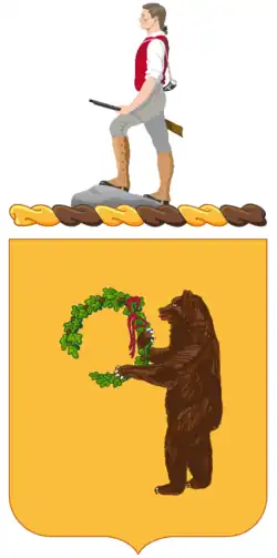 The regimental coat of arms was approved on 10 November 1924 and its distinctive unit insignia was approved on 8 January 1925. The distinctive unit insignia consisted of a standing grizzly bear holding a garland of oak leaves and acorns tied with a ribbon in his paws over a gold background. The regimental motto, "Tiens ta Foi" (Hold thy Faith) was attached on a ribbon scroll below the insignia. The yellow represented cavalry, the bear was from the Seal of Missouri, and the wreath from the Seal of Arkansas, the two state to which the 321st was allocated. The coat of arms was of a similar design except that it omitted the motto and included the Organized Reserve Minuteman crest above the shield.[4]