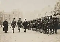 By early December, it had received the equipment assigned to it and was judged to be ready for deployment. War Department inspectors found the division more advanced in its training than any other division in the United States. Orders were received in late December, and the first troops left Waco on 2 January 1918 for the New York Port of Embarkation at Hoboken, New Jersey. The infantry was moved first, arriving at Camp Merritt before the division headquarters sailed.[7] The unit received its first casualties when the SS Tuscania (1914) was sunk by a German U-boat. Brigadier General William G. Haan led the unit when it arrived in France.