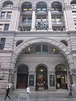 The less exposed Ash Street facade is in brick relieved by a trachyte base, string-course, window mullions and spandrels. The main George Street entrance is dominated by a huge arch spanning some 13 metres each individual voussoir weighs three tons. The unusual recessed facade above has window balconies on the second, third and fourth floors behind classical columns. Building materials are all of high quality.[1]