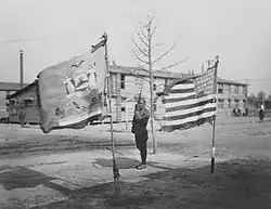 At the end of the war, the 369th returned to New York City, and on 17 February 1919, paraded through the city.[32] This day became an unofficial holiday of sorts for all of Harlem. Many black school children were dismissed from school so that they could attend the parade.[33] With the addition of many adults there were thousands of people that lined the streets to see the 369th Regiment: the parade began on Fifth Avenue at 61st Street, proceeded uptown past ranks of white bystanders, turned west on 110th Street, and then turned onto Lenox Avenue, and marched into Harlem, where black New Yorkers packed the sidewalks to see them. The parade became a marker of African American service to the nation, a frequent point of reference for those campaigning for civil rights. There were multiple parades that took place throughout the nation, many of these parades included all black regiments, including the 370th from Illinois. Then in the 1920s and 1930s, the 369th was a regular presence on Harlem's streets, each year marching through the neighborhood from their armory to catch a train to their annual summer camp, and then back through the neighborhood on their return two weeks later.[34]