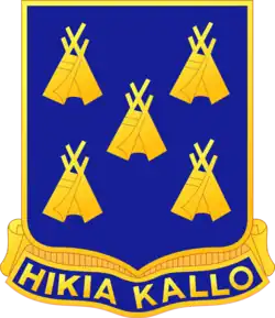 The 378th Infantry Regiment's distinctive unit insignia (DUI) and coat of arms depict five wigwams, organized in rows of two, one, and two on a blue field.[5] Blue represents the Infantry, and the five wigwams the Five Civilized Tribes of Oklahoma, where the regiment was organized— the Choctaw, Cherokee, Creek, Chickasaw, and Seminole.[5]