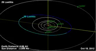 39 Laetitia is a large main-belt asteroid that was discovered by French astronomer Jean Chacornac on 9 February 1856[8] and named after Laetitia, a minor Roman goddess of gaiety. The spectrum matches an S-type, indicating a stony (silicate) composition. It is orbiting the Sun with a period of 4.61 years and is spinning on its axis once every 5.1 hours.